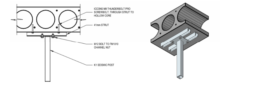Example Fixing Detail Above: Detail shows fixed posts to the hollowcore, with strut to allow anchors to be installed in the thick section of panel, while missing the post tensioned strands.