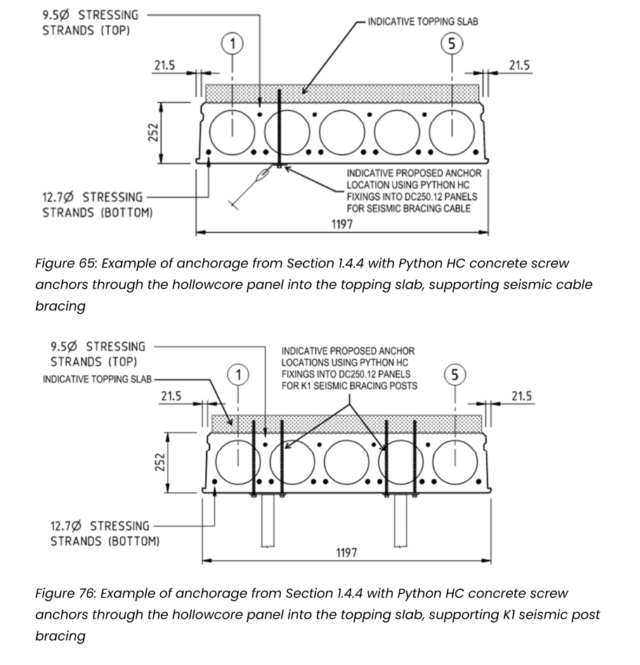 Example Fixing Detail Above: In some cases the topping slab was used with long anchors passing all the way through the hollowcore